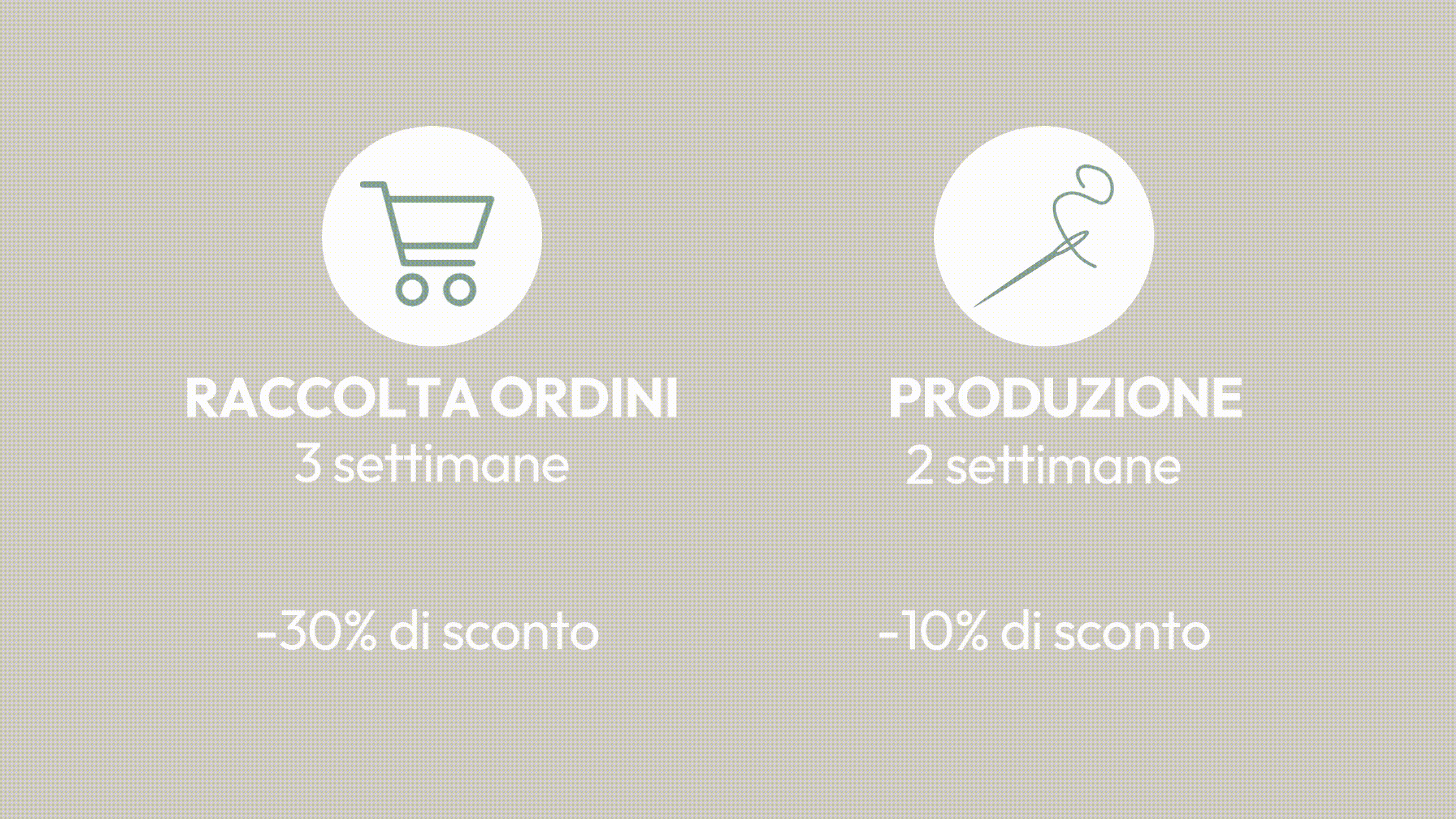 - Raccolta Ordini: Per i primi 21 giorni dal lancio di un nuovo prodotto raccogliamo gli ordini e acquistiamo le materie prime necessarie. In cambio il cliente riceve un 30% di sconto per questa attesa “extra”.